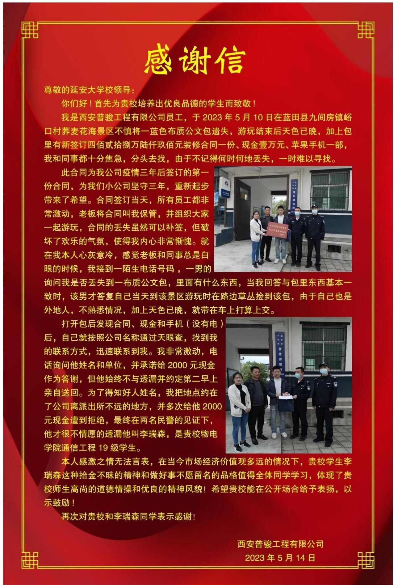 会上,全体起立奏唱中华人民共和国国歌。肖金学介绍了通信19班李瑞森同学“拾金不昧”先进事迹基本情况,宣读了公司表彰决定。张富春向李瑞森颁发了荣誉证书,常胜伟为李瑞森佩戴绶带。李瑞森在交流发言时说道:捡到东西要归失主是普通的一件小事,自己良好习惯的养成得益于优良家风中父母的言传身教,得益于母校老师的辛勤培育,特别是大学四年,在延安这片红色的沃土上,在英国正版365官方网站这座红色熔炉中,延安精神对自己潜移默化地滋养。同学代表杨嘉成,辅导员冯晓依次作了交流发言。袁松岩老师代表公司宣读了向李瑞森同学学习的倡议书。