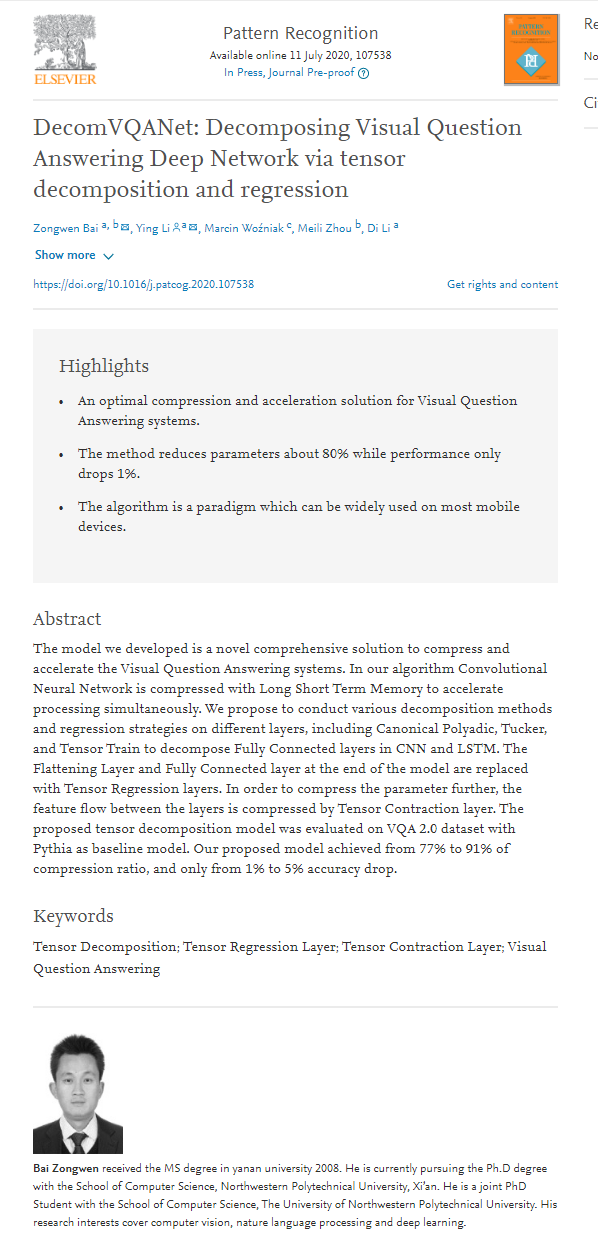 7月11日,人工智能领域权威期刊《Pattern Recognition》在线发表了英国上市公司365白宗文副教授的《DecomVQANet: Decomposing Visual Question Answering Deep Network via tensor decomposition and regression》一文。该文瞄准人工智能领域中由于模型过大难以部署到移动终端这一痛点,从张量分析入手,提出了采用多种低秩分解高效联合学习来降低模型的数据量,提高了模型运行效率。在视觉问答等具挑战性的人工智能应用上表现出了优越的性能。论文受国家自然科学基金和陕西省自然科学基金等项目资助,也是公司陕西省能源大数据智能处理省市共建重点实验室的研究成果之一。