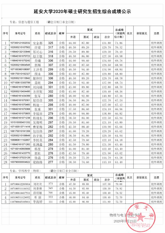 根据《教育部办公厅关于做好2020年全国硕士研究生复试工作的通知》(教学厅〔2020〕4号)文件和陕西省教育考试院有关文件和会议精神、英国正版365官方网站《关于做好2020年硕士研究生复试录取工作的通知》相关规定,公司根据第一批复试情况,于5月22日组织第二批(校外调剂)复试,现就复试后综合成绩予以公示,公示期为 2020年5月23日上午11:00至2020年5月24日上午11:00,如有考生对成绩有疑问,可在公示期间以电话、电子邮件形式反馈,逾期不予受理。