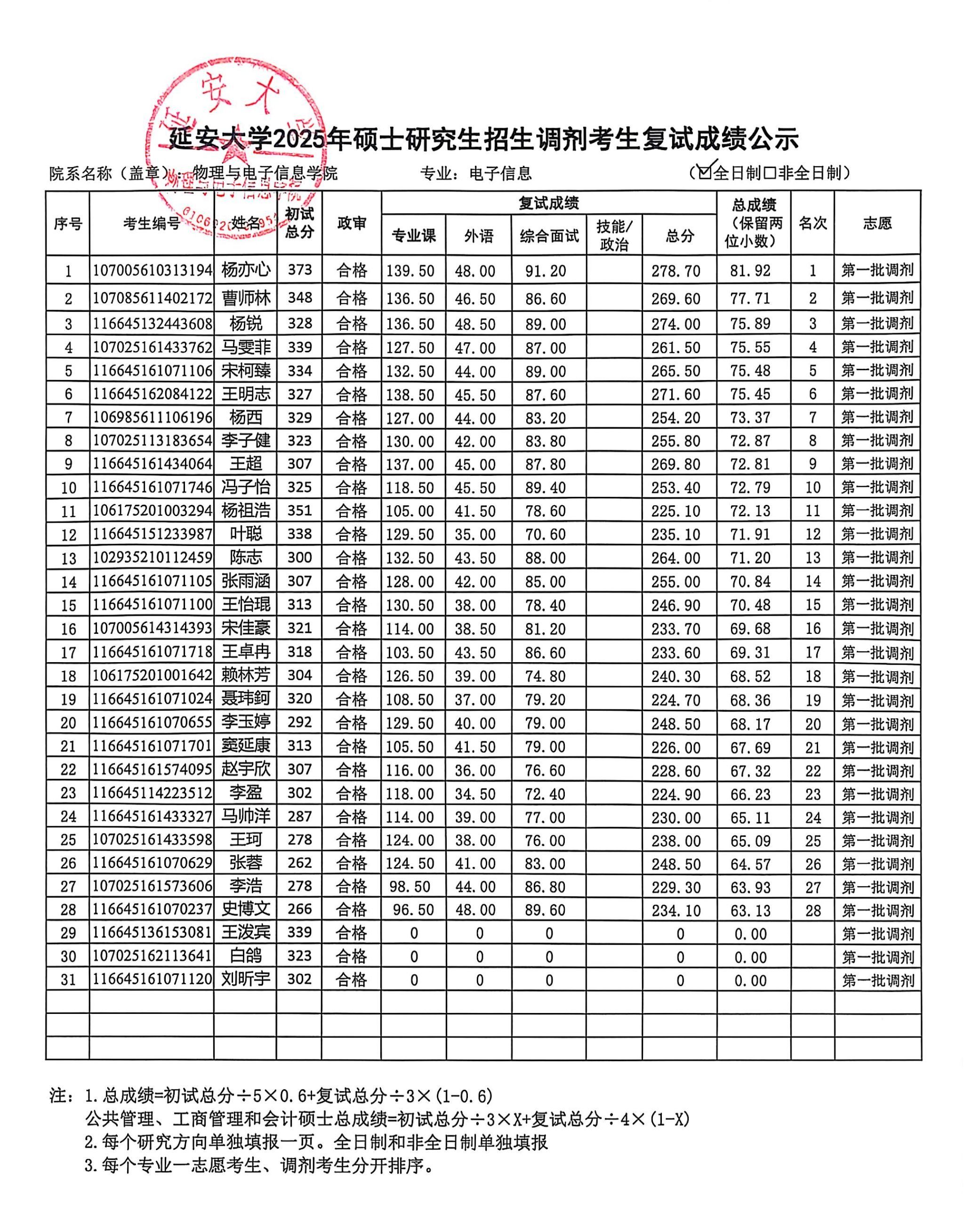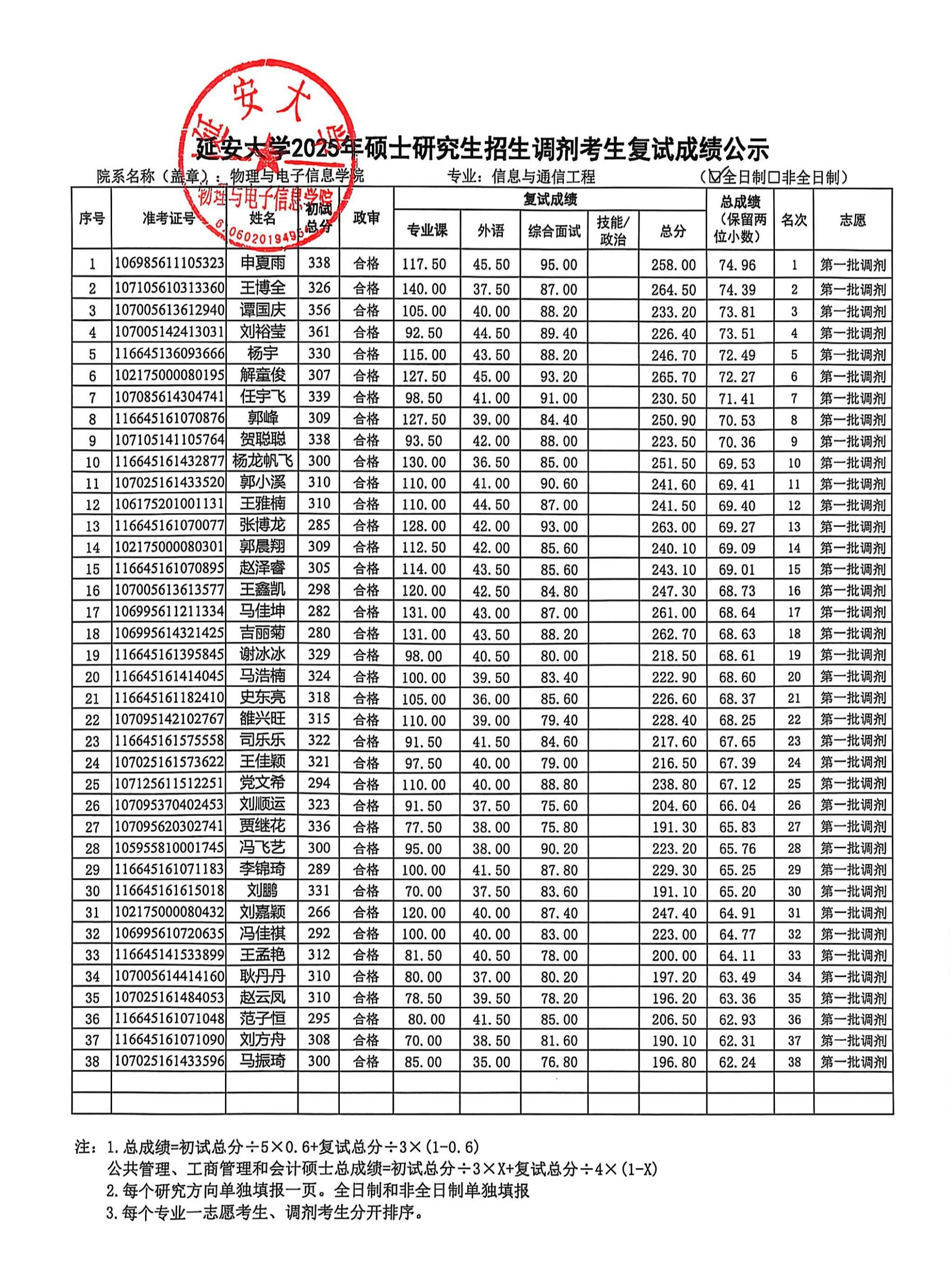 依照公司2025年硕士研究生复试工作实施方案,安排在2025年4月9日的信息与通信工程和电子信息专业调剂考生复试工作已经圆满结束。复试成绩上报研究生院审核后,现将具体的复试成绩进行公示,公示时间为十个工作日,如有异议,请按照以下联系方式进行咨询。