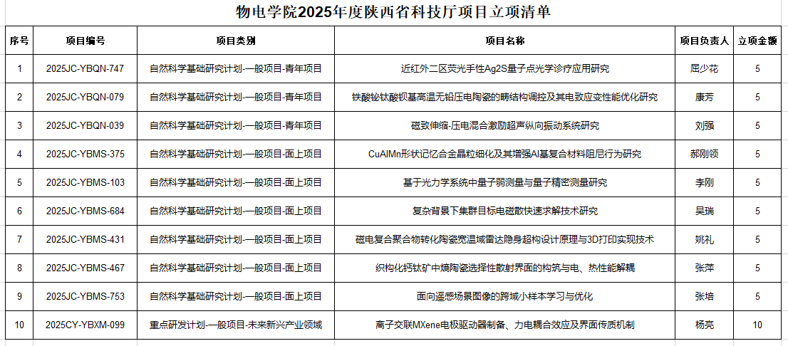 近日,陕西省科技厅公布了2025年度科技计划项目立项结果。公司共有10项项目获批立项,其中青年项目3项,面上项目6项,重点研发计划项目1项。立项数量创历史新高!与去年相比,立项数量增长25%,获批项目总经费达到55万元,较去年增长14.5%。
