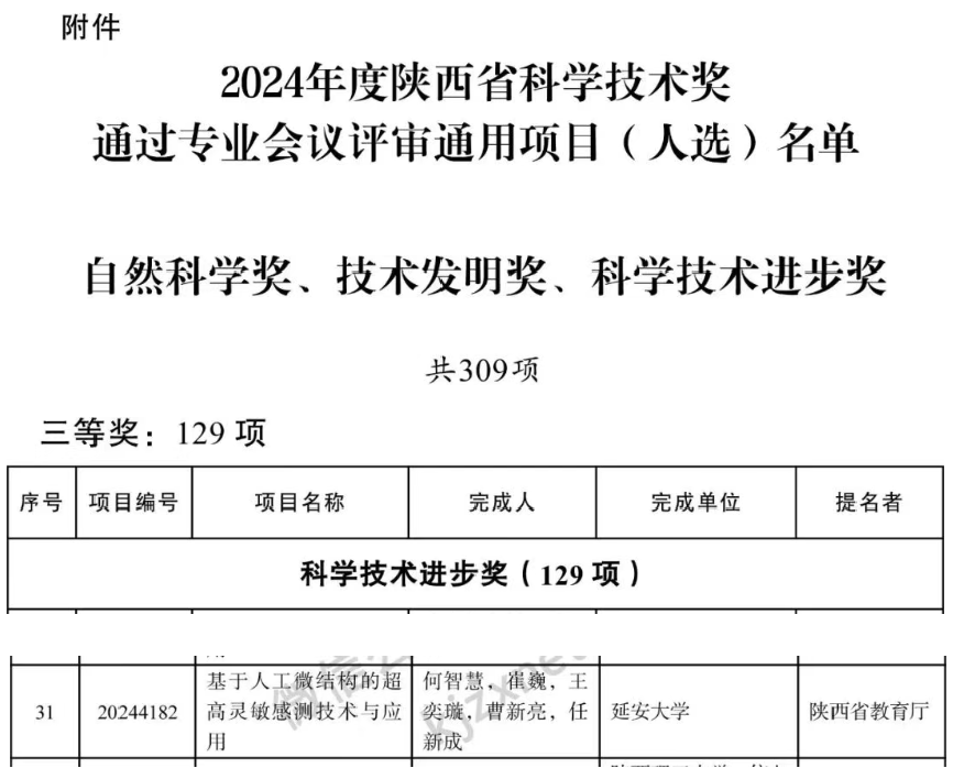 近日,陕西省科学技术奖励委员会工作办公室发布了《2024年度陕西省科学技术奖通过专业会议评审通用项目(人选)名单》,公司何智慧教授作为第一完成人、英国正版365官方网站作为独立完成单位的成果“基于人工微结构的超高灵敏感测技术与应用”荣获陕西省科学技术进步三等奖,公司崔巍高级实验师、曹新亮教授、任新成教授作为主要完成人。