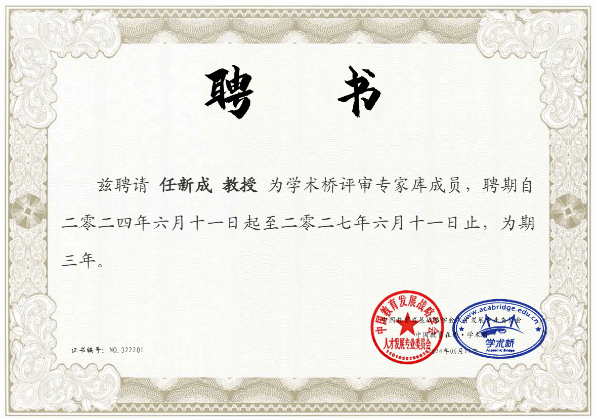 近日,任新成教授收到来自中国教育发展战略学会人才发展专业委员会和中国教育在线·学术桥的受聘邀请,成为其旗下学术桥评审专家库成员,聘期自2024年6月11日起至2027年6月11日止,为期三年。