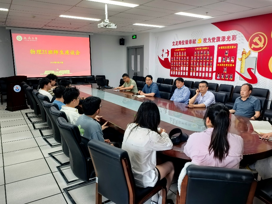 为深化人才培养模式改革,搭建师生互动交流平台,物理系于5月29日下午召开物理21级毕业生座谈会。教学副经理何智慧教授、学科带头人郝刚领教授、物理系副主任李伟副教授、教师代表杨能勋教授、任新成教授、石延梅副教授以及物理21级员工代表参会,围绕学业规划、实践能力培养、2025版人才培养方案修订建议等议题展开深入交流,本次会议由杨能勋教授主持。