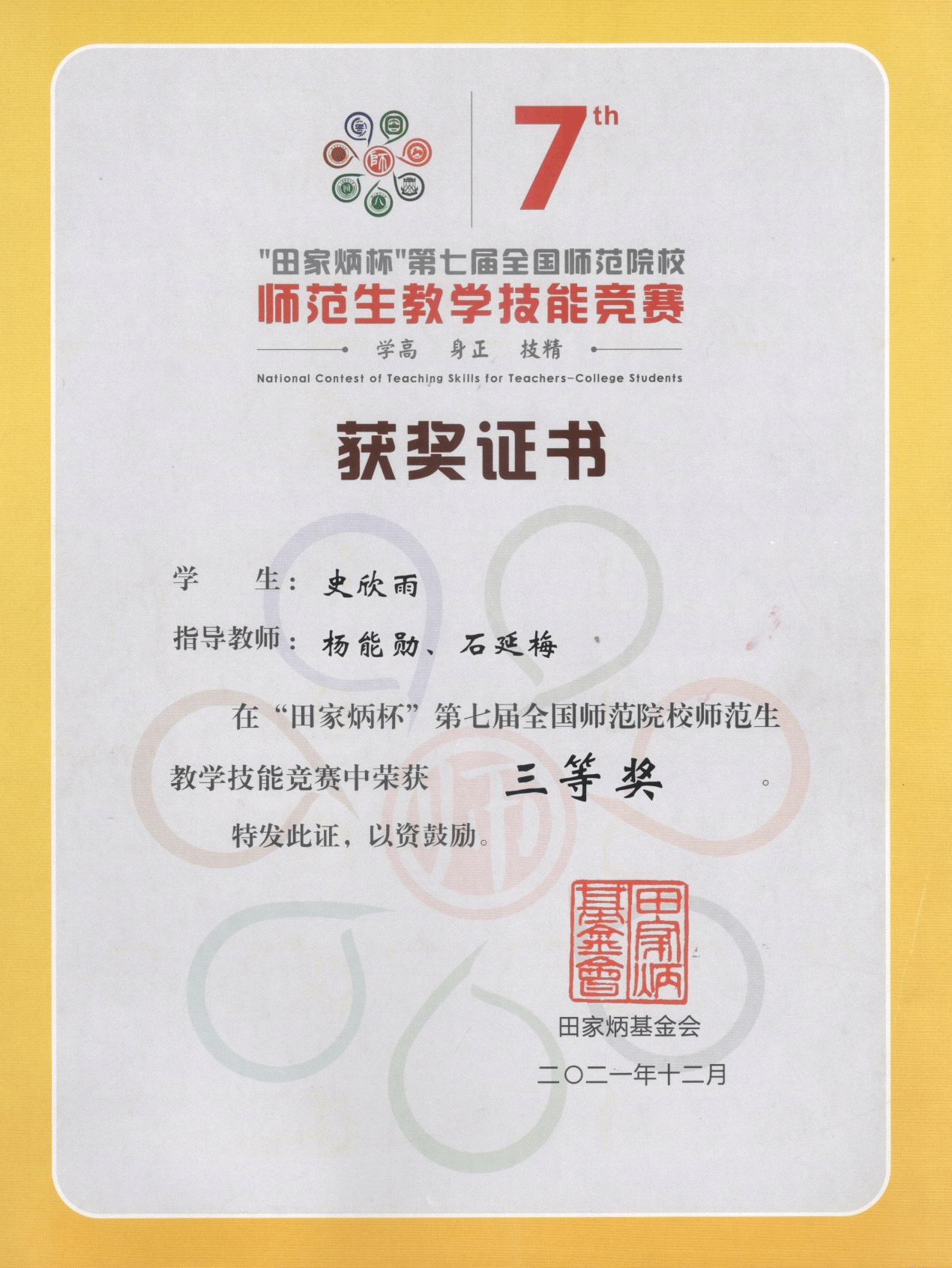 据悉,在第七届和第八届“田家炳杯”全国师范院校师范生教学技能竞赛公司员工物理19班员工刘萌、史欣雨荣获三等奖。